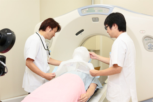 - 治療計画CT:実際の治療開始の1日~2週間前に、放射線治療部門内にある専用装置にて、治療計画CTを撮影します。撮影には数十分かかります。外来初診日同日に撮影する場合と、後日改めて撮影に来ていただく場合があります。CT撮影と同時に、頭部固定用マスクを作成したり、皮膚に位置確認のマークを付けたりします。このCT撮影は、治療計画のために行うものです。放射線照射の角度、照射範囲、強さのバランスなどを、患者さんの体型や、腫瘍の場所、広がり、性質にもとづいて精密にデザインし、個々の患者さんごとに放射線照射の設計図を作成します。