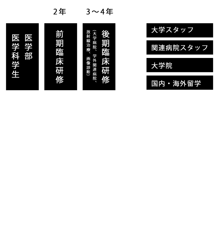 - 医師免許を取得し2年間の臨床研修を終えた後に放射線治療科に入局すると同時に日本放射線腫瘍学会および日本医学放射線学会に入会します。入局1年目から3年目(卒後3年目から5年目)は、放射線科専門医取得のために画像診断科と協同で研修を行います。この期間には、治療計画や日常診察など放射線治療に関してはもちろんですが、癌の病期診断や放射線治療計画には画像診断の知識が必要となりますので、画像診断を含めた放射線科としての基礎全般の知識を習得するための研修を行います。研修は大学病院または関連施設をローテートしながら行います。研修は放射線治療、画像診断を満遍なくしてもらいますが、それぞれどれくらいのウエイトを置くかは個別に相談して決めていきます。放射線科専門医取得後は、2年後の放射線治療専門医試験合格に向けてさらに専門的な研修を行います。これらの期間または放射線治療専門医取得後を含めて、学位の所得を目指して大学院への進学も歓迎します。将来は大学病院や関連病院のスタッフとして研究・教育や診療に放射線治療医として活躍してもらいます。